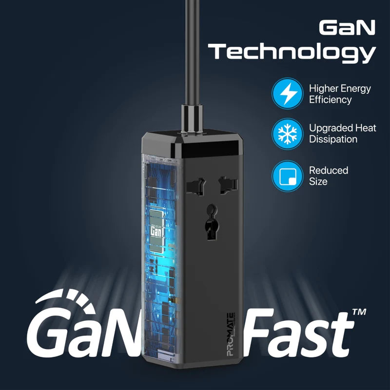 Promate 65W Ganfast™ Multi-Port Power Strip With Universal Ac Socket, Black