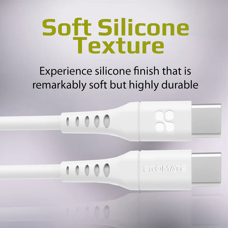 Promate 60W Power Delivery Ultra-Fast Usb-C Soft Silicon Cable, 200Cm, White