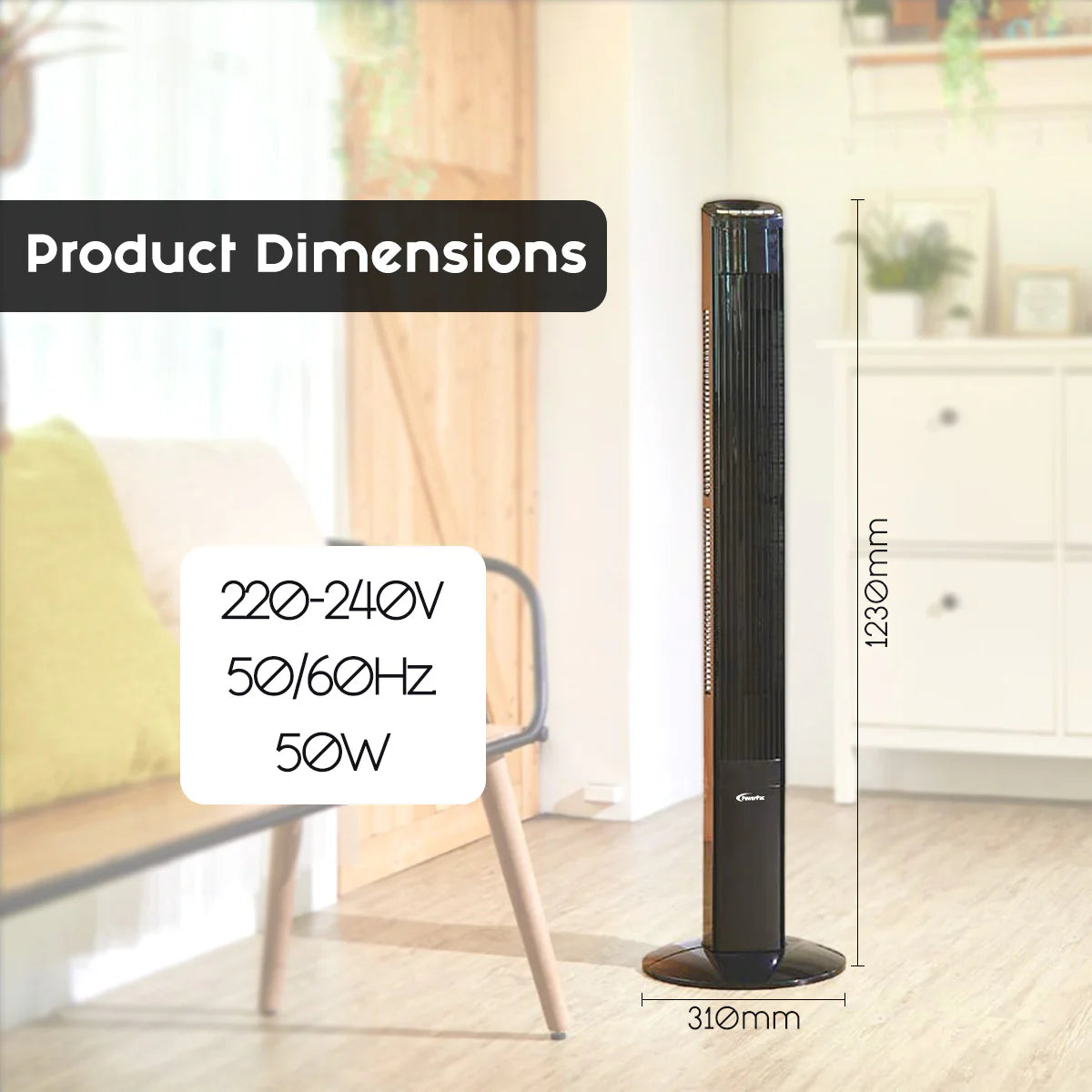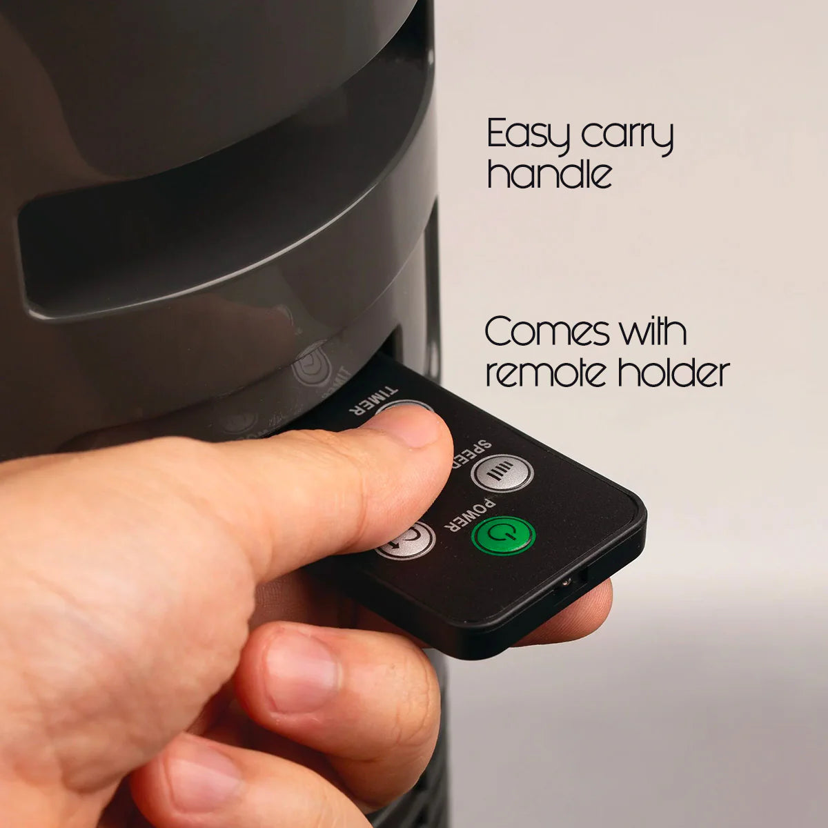 Experience a powerful cool breeze with the PowerPac 46" Tower Fan. With its impeller blades and 90-degree angle, it pulls air through the slits for efficient forced convection. The oscillation and remote control features make it convenient to use. Its sleek design adds a touch of style to any room.