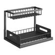 This heavy-duty 2-tier L-shaped sliding basket organizer maximizes under-sink space in kitchens and bathrooms. Constructed from durable metal with a sleek black finish, it features pull-out drawers that provide easy access to cleaning supplies, cookware, or bath essentials while efficiently utilizing corner spaces. The robust design ensures stability even when fully loaded.