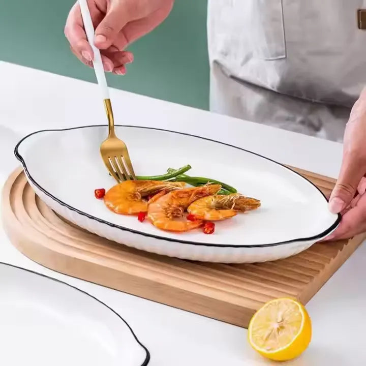 This large 12-inch fish plate features a sleek black edge and dual handles for easy serving. Its generous size accommodates whole fish or large portions, making it ideal for elegant presentations and practical use. Crafted for durability and style, it enhances any dining experience with a refined touch.