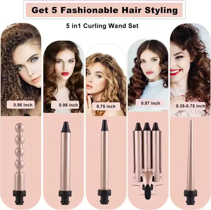 | Barrel Types | • 19mm cylinder • 25mm cylinder • 25mm spiral • 22mm 3-barrel mermaid waver • 9–19mm cone Perfect for spiral curls, natural curls, and wavy styles |