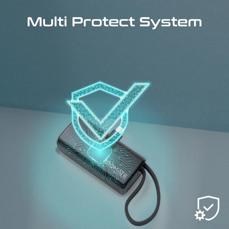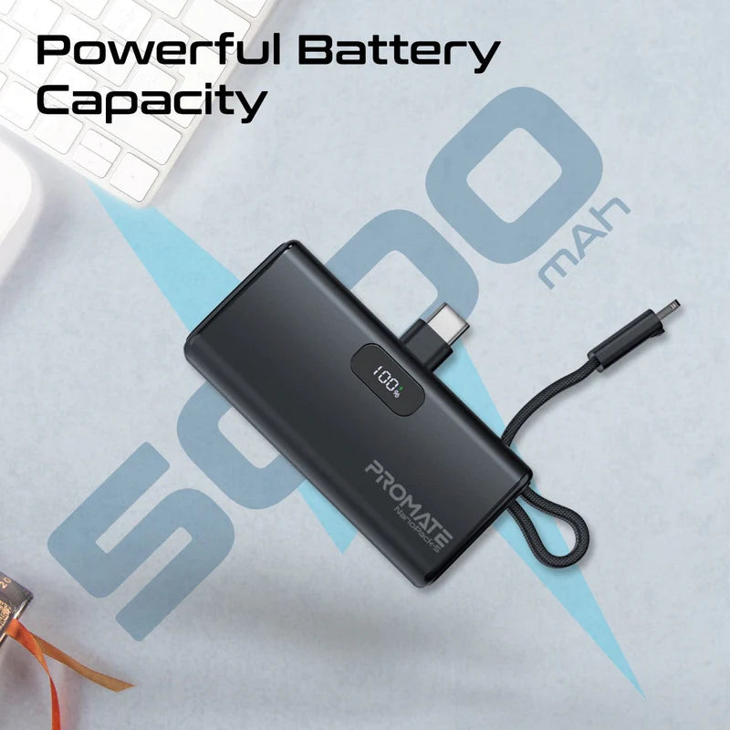 Promate presents the NanoPack-5, your ultimate portable charging companion. With a 5000mAh battery, built-in 18W Lightning cable, and 20W USB-C port, enjoy fast and convenient charging on the go. Designed with safety in mind, the Multi Protect System ensures protection from overcharging. Stay informed with the smart LED screen and enjoy its ultra-compact design with a foldable kickstand.