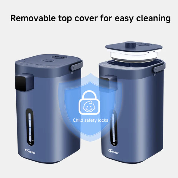 Upgrade your hot water dispenser with the PowerPac Electric Thermo Pot 5L PPA80/5. Featuring touch-sensitive buttons and a LED display screen, easily choose from 11 temperatures for your desired Keep Warm temperature. The food-grade SUS 304 Stainless Steel Inner Pot & Lid ensures safety and convenience, while the removable Lid eliminates the risk of accidents. Enjoy hot water anytime with the PowerPac 5L Electric Airpot.