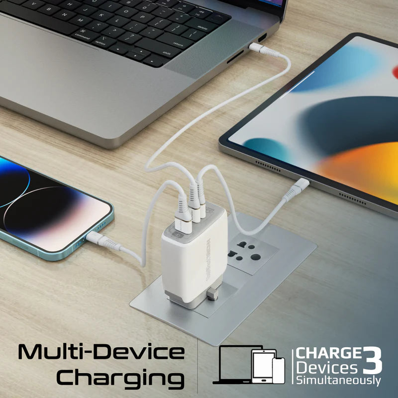 Introducing Promate's 120W Super-Speed GaNFast Charger, powered by advanced GaN technology for faster, more efficient charging. With dual USB-C Power Delivery ports and a QC 3.0 USB port, charge up to 3 devices at maximum speeds. Enjoy reliable, safe charging with protection against overcharging and short-circuiting.