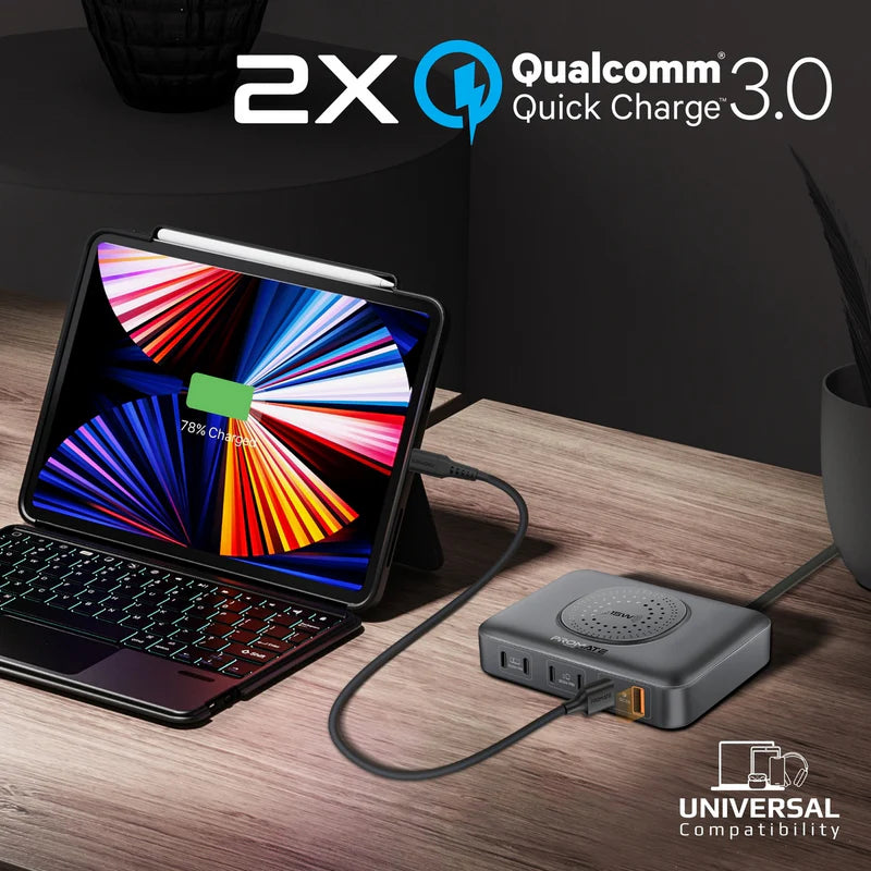 Upgrade to super speed charging with Promate GaNFast 100W Power Delivery Charging Station. With Gallium Nitride components, this compact station efficiently charges 4 devices simultaneously. Includes 15W wireless charging module for compatible devices and Qualcomm Quick Charge 3.0 ports for 4X faster speeds. Experience rapid charging in a flash.